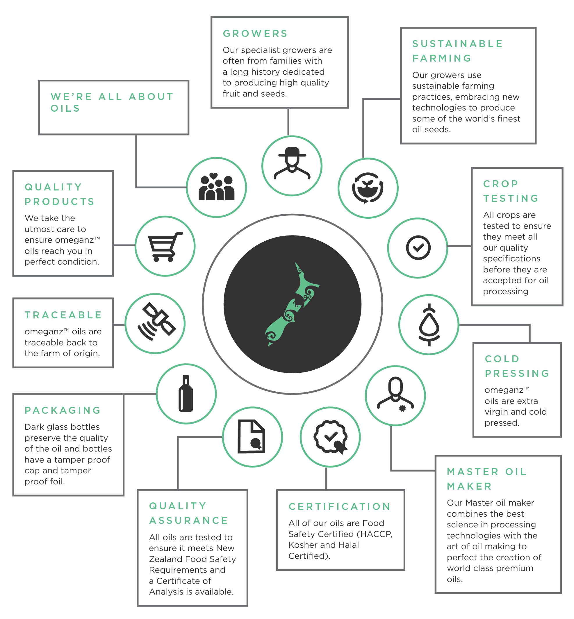 We use IANZ certified laboratories who confirm that the oil we sell meets international standards in a wide range of markets. Each specialty oil we make is batch tested to ensure a high nutritional quality for the optimal health for our consumers.
